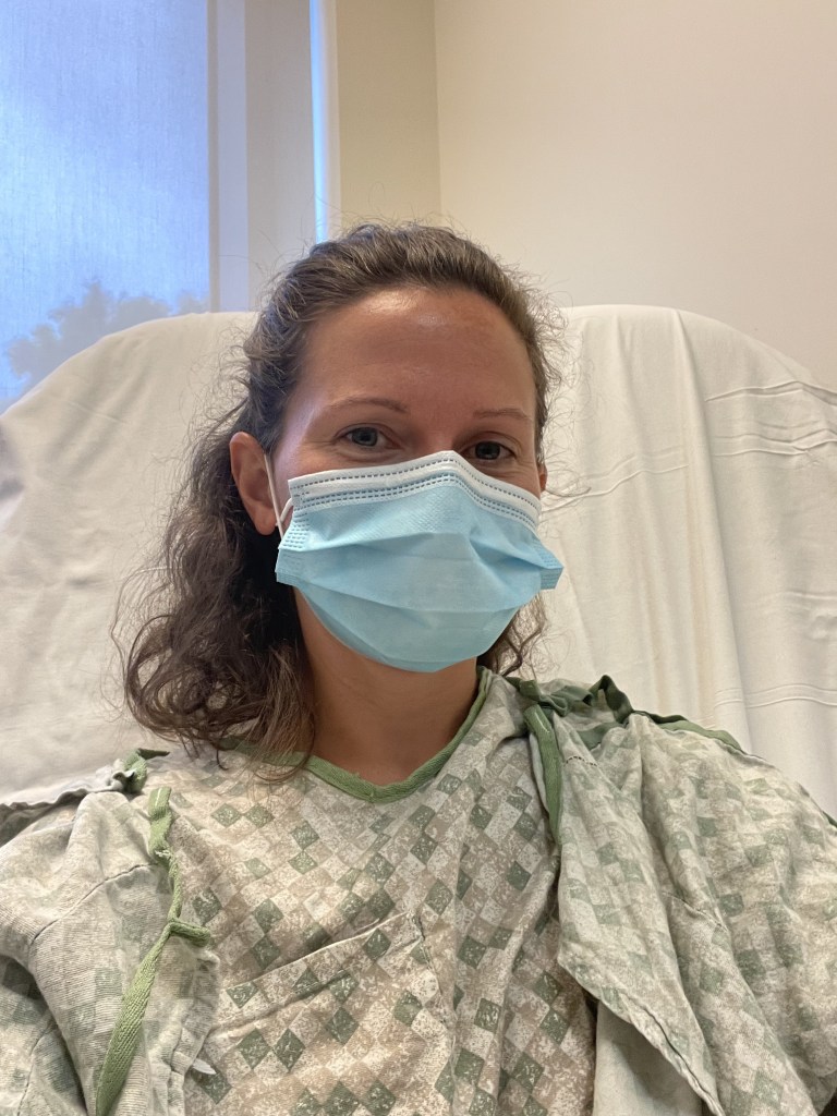 For some reason, I was more nervous for this surgery than my other ones. It’s possible the nerves from my previous surgeries weren’t as fresh in my mind. I knew the port would sit in my upper chest and that I’d see the little tube that goes from the port up to my jugular vein and down to my heart. Obviously, you don’t see it in my heart, but you see the tube go up my chest, over my clavicle bone and into my neck vein. Lovely. All of those details seemed so invasive to me. Before they were just cutting peripheral chunks out of my body, now they are probing deeper and near my heart! Everyone was saying, “Oh, an interventional radiologist could do it” like that meant something to me or it was comparable to saying a child could do it. My surgeon reassured me that she’s done many of these and only encountered major issues once in the last 10 years. Also, my blood pressure was 94/61, so I must not have been too nervous!