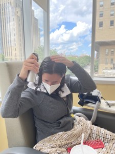 Luckily, this transfusion was only an hour and it, too, was uneventful. It really did feel like it was over before I knew it. By now it was 3:00 PM and both Sean and I were tired of being at the hospital. I was also tired from all of the drugs, too. But I needed to finish up with a 90-minute post-infusion cooling for my head cap. It wasn’t bad, because my head was still numb, but I was tired of wearing the thing for 3 hours! Once the cap came off, I had a really nice frost going on the top of my head so there was no question my head was cold!