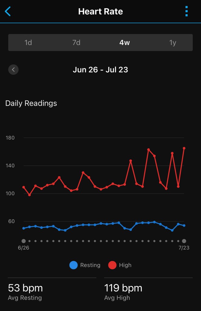 This breast cancer journey has put me through physical, mental and emotional stresses over the last few months and I can see those stresses in my data. I was able to establish a baseline in most of my health and performance metrics prior to this experience and I can see how this experience has affected those metrics. The surgeries prevented me for weeks from doing most of the strenuous activity that I’m accustomed to doing, so I can see my VO2 max decrease and my resting heart rate slightly increase. I can also see the emotional stress of learning of my diagnosis and the nerves and worry I experienced in the days leading up to procedures or tests results by higher daily overall stress scores or difficulty getting full body battery “charge.” I can see the healing process in my metrics as well. My resting heart rate will be elevated in the days following procedures or treatments. My sleep won’t be as restful unless I received some sedative-type medications. And I wasn’t able to get back to my baseline before my chemotherapy started, so things just relatively feel more off to me.