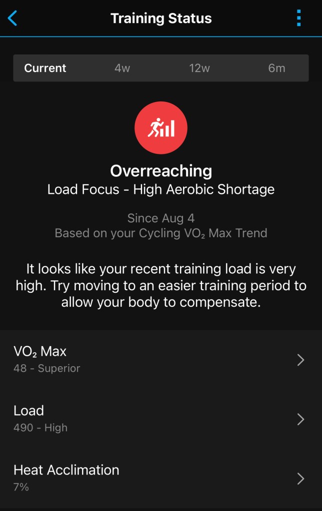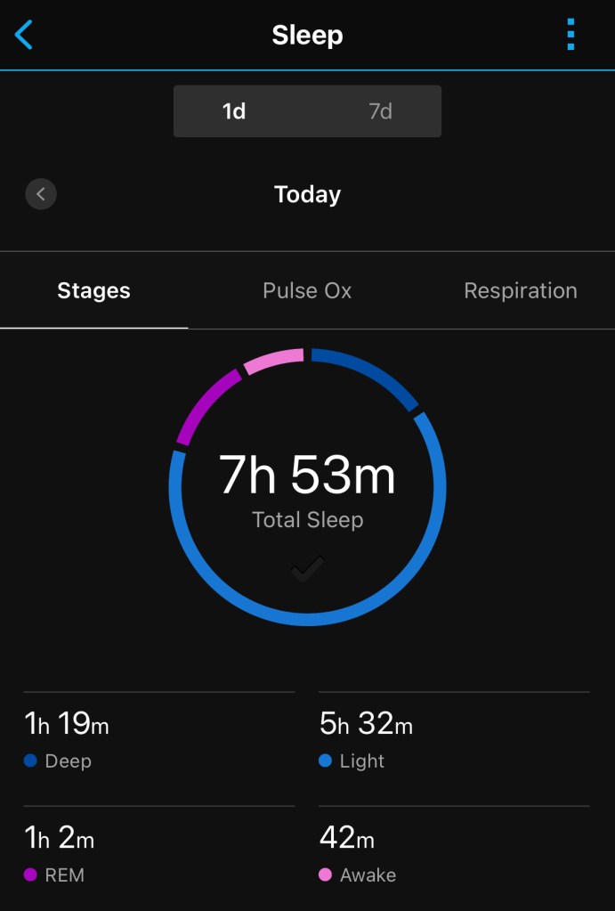 The main things I look at are my Sleep, Training Status, Stress and Body Battery. Sleep gives you a breakdown of the amount of time spent in the different sleep stages and you can look at Sleep Score that gives you an evaluation of how ideal your sleep was given the overall amount of sleep and if you spent adequate time in the various sleep stages. Training Status looks at your VO2 Max, your overall training load over compared to the last several weeks and your heat acclimation. Stress is calculated based on your heart rate variability throughout the day and uses a 3rd party algorithm to gauge how “stressful” your day was and if you spent enough time resting to avoid bottoming out. I’ve included some screenshots of examples of all of these. You will notice that right now it gauges that I’m overreaching because I’ve somewhat aggressively ramped up my training since not having worked out after my surgeries. I’m going to try to take it easy the next few days so I have time to recover.