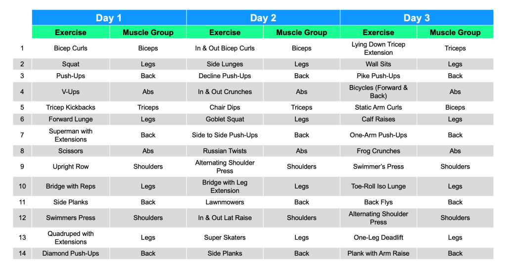 I wanted each day to be a full-body routine and I wanted each day to be different to add some variety. I complete the entire routine three times. I will also incrementally increase the weight for weighted exercises as the weeks go by as long as I can maintain it. Some of these exercises were favorites from my P90X routines and some are fairly common weight lifting moves.