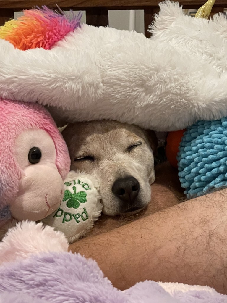 Then we went upstairs and tried to read some books. We got her a new book that is the Moana movie, but in book form. She really likes it, but she does this thing where she says, “I’m going to be the teacher!” Then she looks at the book, occasionally holds it up to show us the pictures and narrates the story herself. It’s kind of funny. I’m not sure why she won’t let us read her some stories. Ginny came upstairs to be with us and she snuggled into Maddie’s stuffed animals to listen to the stories.