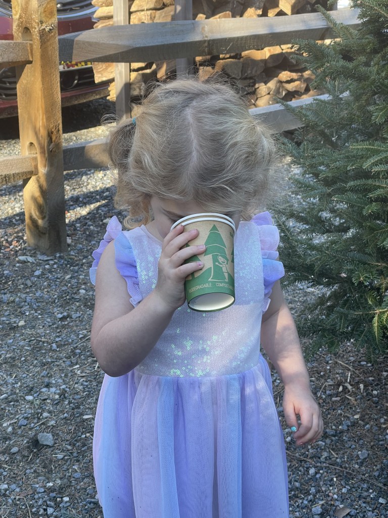 Maddie enjoying some hot chocolate while picking our tree. Yes, she is sleeveless…